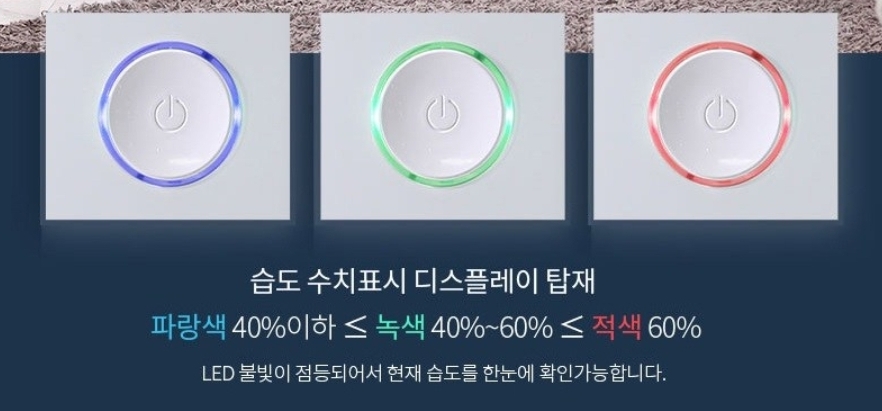 LED로 현재 습도를 나타내주어서 쉽게 집안 상태를 파악할 수 있고, 직관적인 디스플레이를 가지고 있어서 사용하기 편리합니다. 특히 습도 수치를 컬러별로 다르게 표현해주어서 바로 현재 습도를 체크할 수 있는데요. 습도 40% 이하의 경우 파란색, 40~60%는 녹색, 60% 이상은 빨간색으로 나타내줍니다.