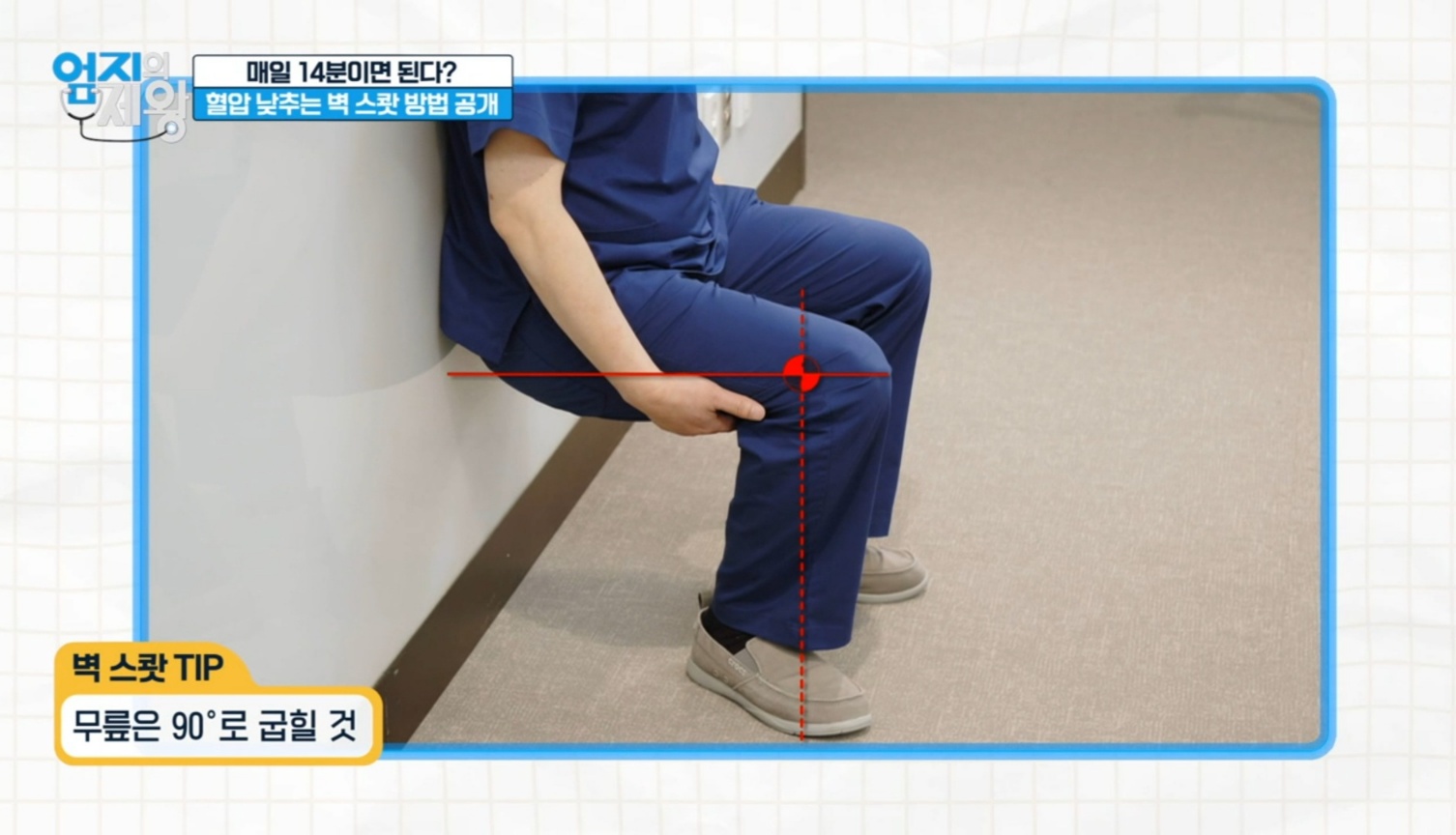 벽스쿼트는 벽에 등을 대고 하는 스쿼트로, 맨몸으로 근육의 수축과 이완을 반복하는 등척성운동입니다. 실내에서 안전하고 쉽게 할 수 있어서 매일 14분씩 2주간 꾸준히 해주시면 혈압관리에 도움이 됩니다.