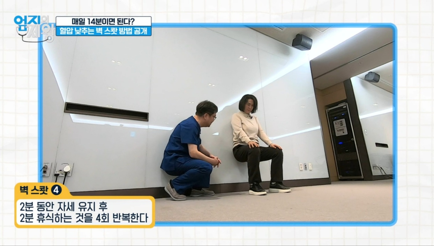 벽스쿼트는 벽에 등을 대고 하는 스쿼트로, 맨몸으로 근육의 수축과 이완을 반복하는 등척성운동입니다. 실내에서 안전하고 쉽게 할 수 있어서 매일 14분씩 2주간 꾸준히 해주시면 혈압관리에 도움이 됩니다.